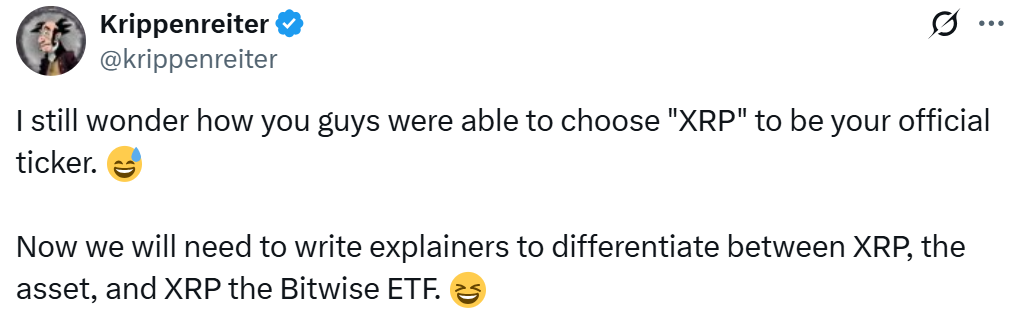 Kullanıcı “Artık varlık olan XRP ile Bitwise ETF olan XRP arasında ayrım yapmak için açıklamalar yazmamız gerekecek” dedi.